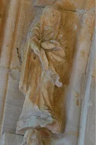 À l’ébrasement gauche, sans que les identités des statues soient certaines, il est tout à fait possible qu’elles accompagnent et amplifient la scène de l’Annonciation. Ainsi Aaron et Ézéchiel sont-ils connus pour être des annonciateurs de la maternité virginale de la Vierge. La sacralité et la virginité de la Vierge sont aussi mises en exergue au tympan, dans la mise en scène peu commune de la Nativité. Les apôtres et les évangélistes des voussures sont des témoins de la vie, du Ministère et de la divinité du Christ. Ainsi, malgré les nombreuses représentations de la Vierge, il ne s’agit pas d’un programme mariologique, étant donné que  ce  ne  sont  pas  des  épisodes  de  la  vie  de  Marie  qui  sont  mis  en évidence.  Mais  Marie  constitue  le  « réceptacle  du  Christ »  et  le  pivot entre l’Ancienne et la Nouvelle Alliance. »